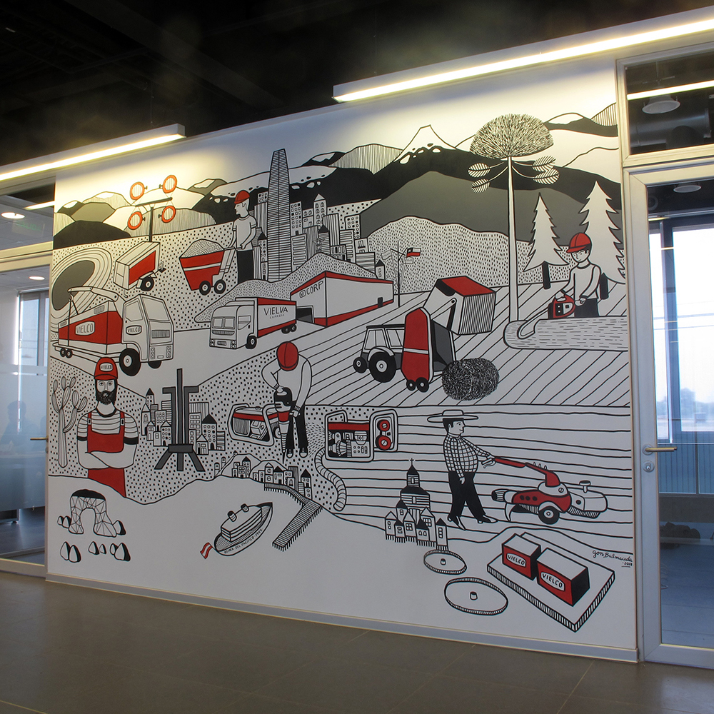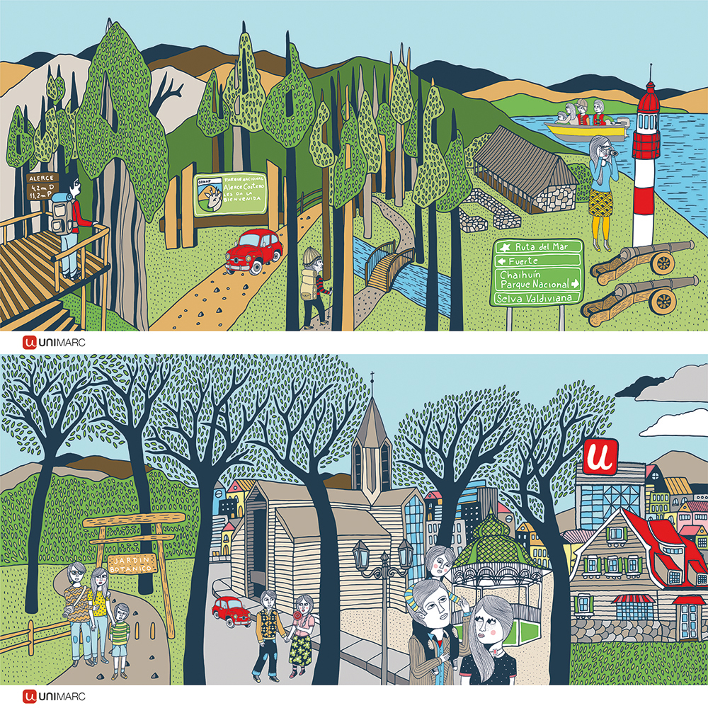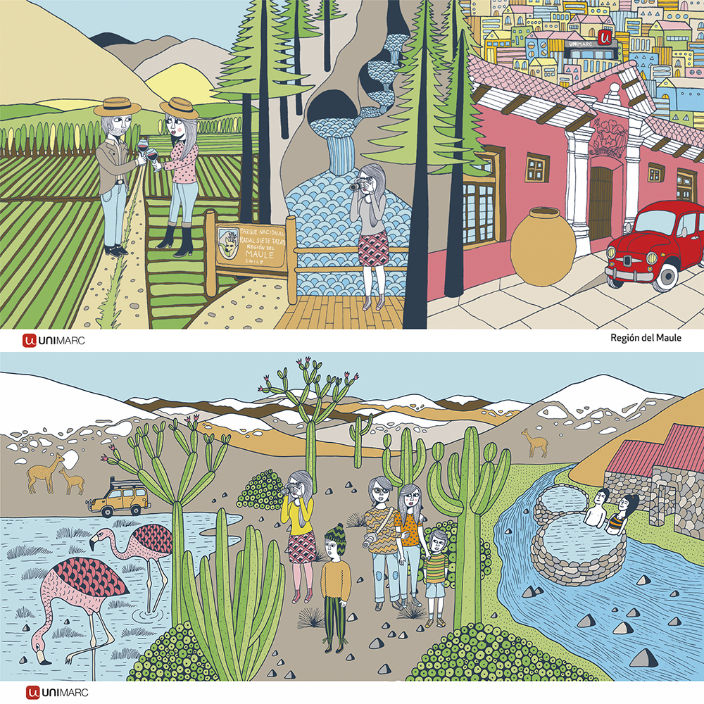 Ilustraciones para empresas en diferentes tipos de formatos, desde catálogos, ilustraciones de gran formato, y trabajos en relación al área corporativa. Aquí destaca la serie de ilustraciones de gran formato que desarrollé durante años para la cadena de supermercados Unimarc, las cuales muestran un recorrido a lo largo de todas las regiones de Chile.